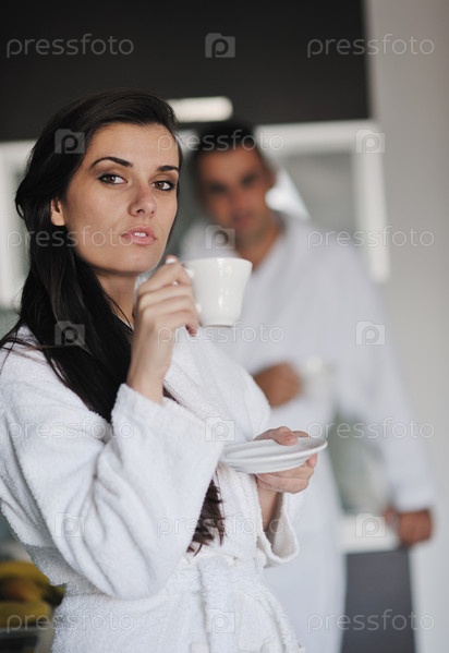 Молодая женщина пьет кофе утром
