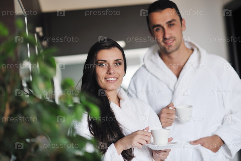 Молодая пара пьет утренний кофе