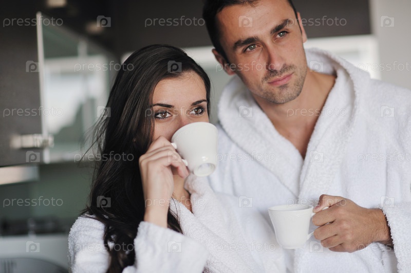 Молодая пара пьет утренний кофе