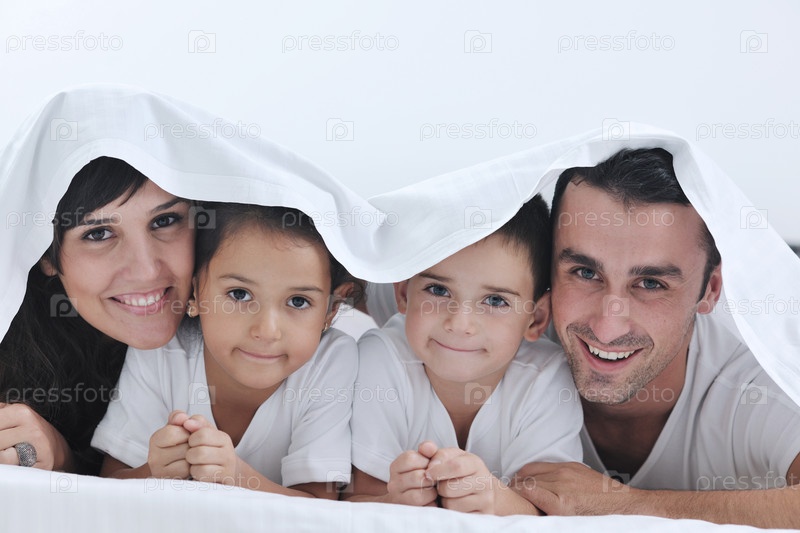 Счастливая семья на кровати в спальне