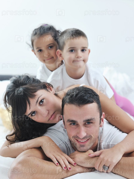 Счастливая семья на кровати в спальне