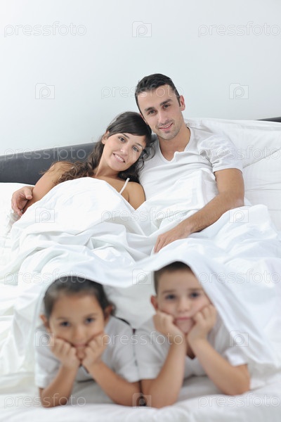Счастливая семья на кровати в спальне