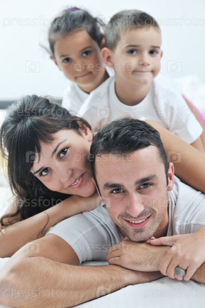 Счастливая семья на кровати в спальне