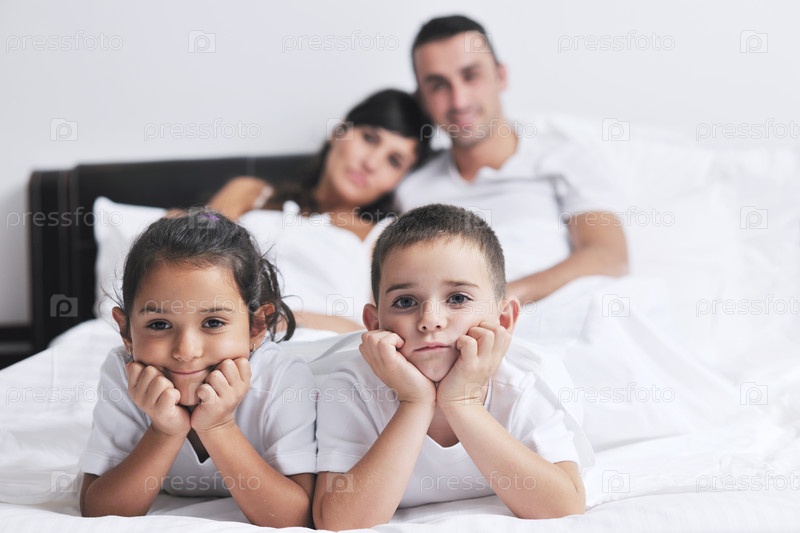 Счастливая семья на кровати в спальне