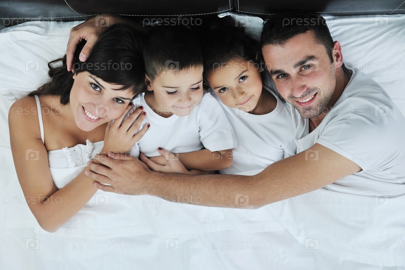 Счастливая семья на кровати в спальне