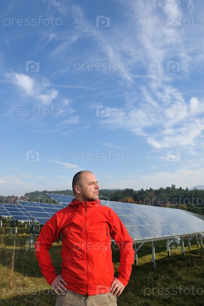 Молодой инженер на фоне солнечных панелей, производящих электричество