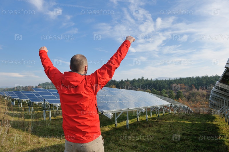 Молодой инженер на фоне солнечных панелей, производящих электричество