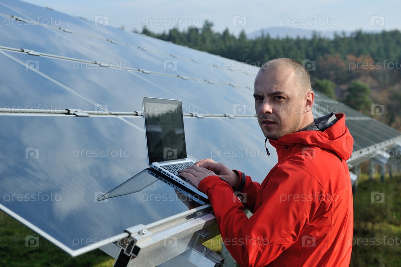Молодой инженер с ноутбуком около солнечных панелей, производящих электричество