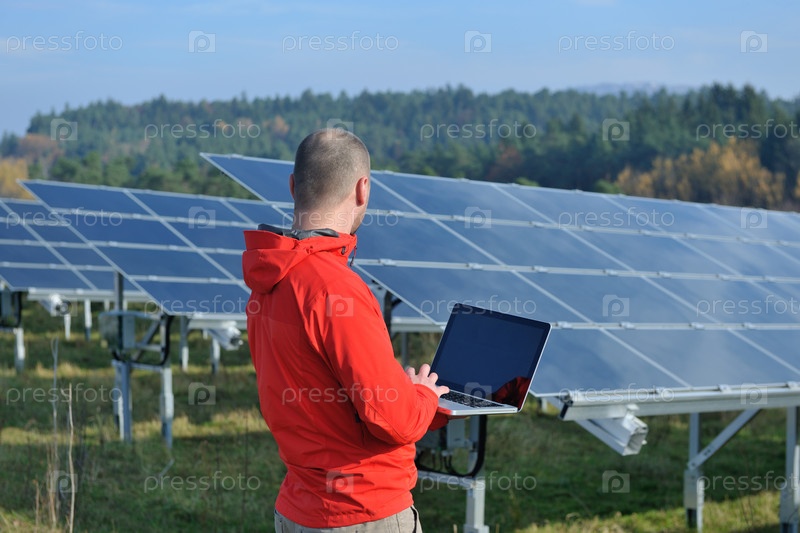 Молодой инженер с ноутбуком на фоне солнечных панелей, производящих электричество