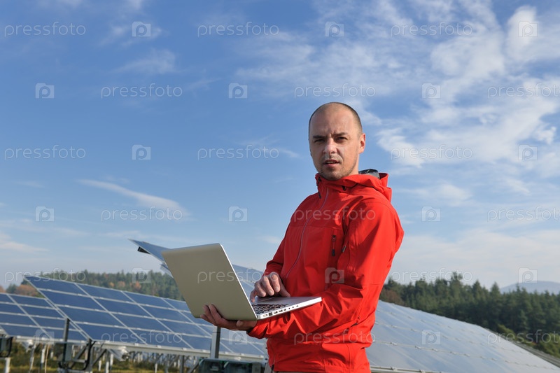 Молодой инженер с ноутбуком на фоне солнечных панелей, производящих электричество
