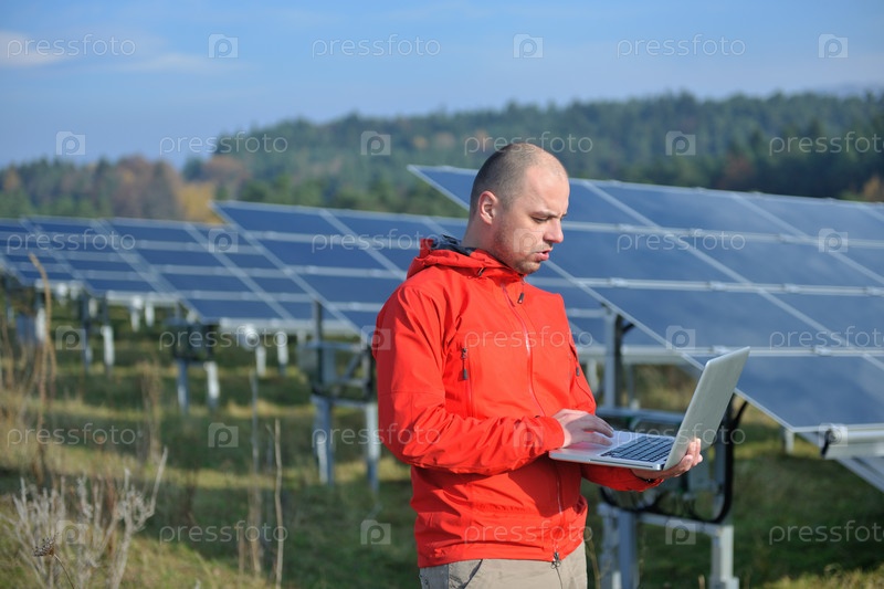 Молодой инженер с ноутбуком на фоне солнечных панелей, производящих электричество
