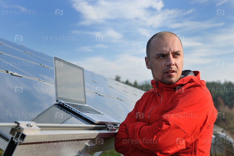 Молодой инженер с ноутбуком около солнечных панелей, производящих электричество