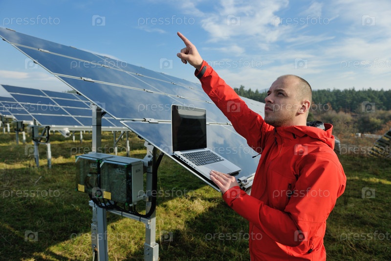 Молодой инженер с ноутбуком около солнечных панелей, производящих электричество
