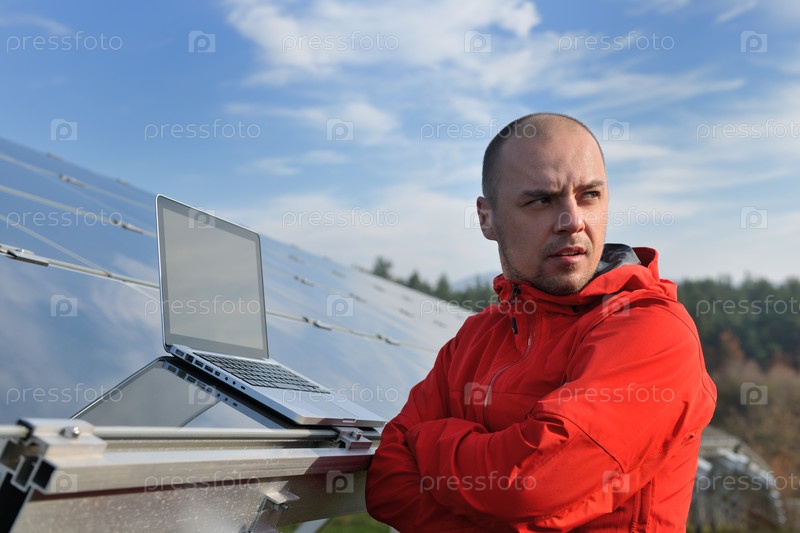 Молодой инженер с ноутбуком около солнечных панелей, производящих электричество