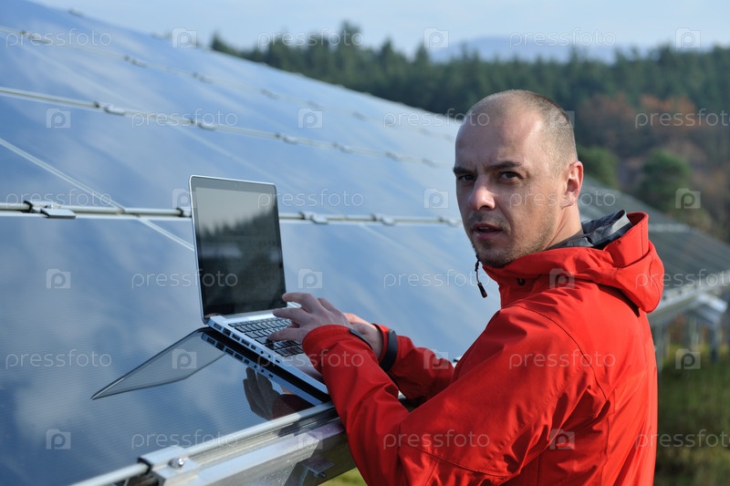 Молодой инженер с ноутбуком около солнечных панелей, производящих электричество
