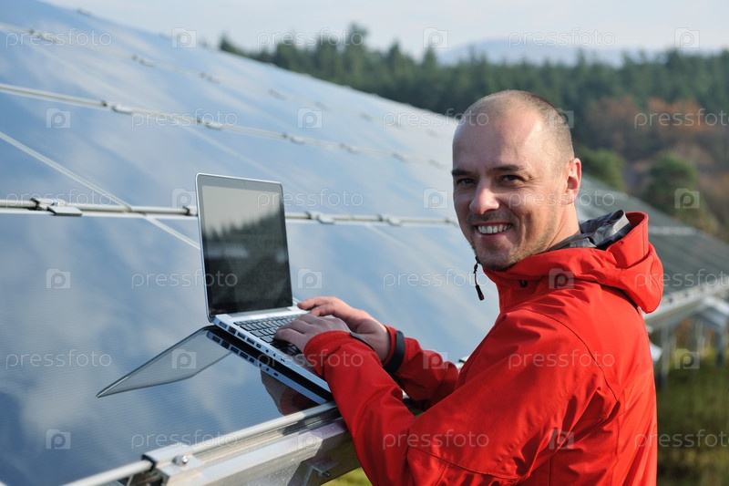 Молодой инженер с ноутбуком около солнечных панелей, производящих электричество