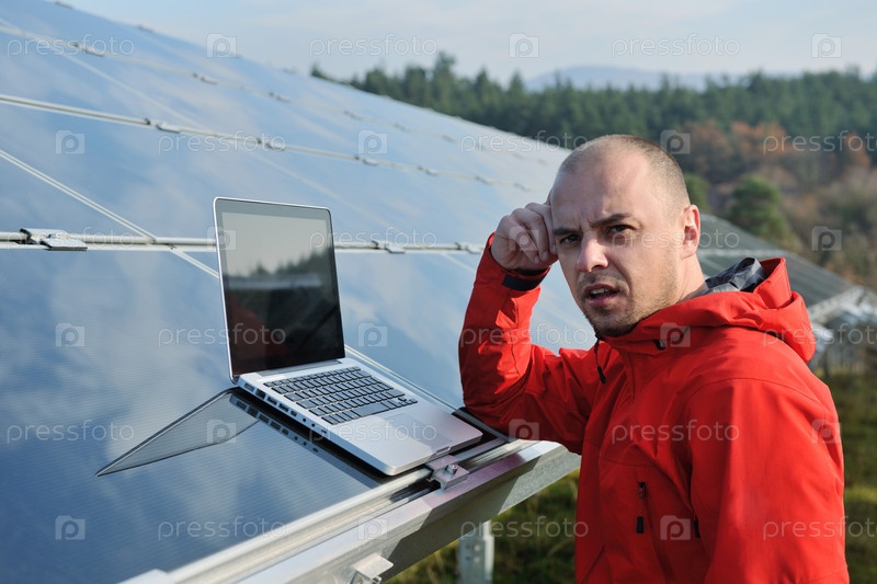 Молодой инженер с ноутбуком около солнечных панелей, производящих электричество