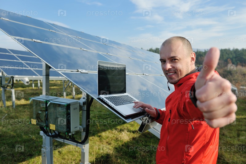 Молодой инженер с ноутбуком около солнечных панелей, производящих электричество