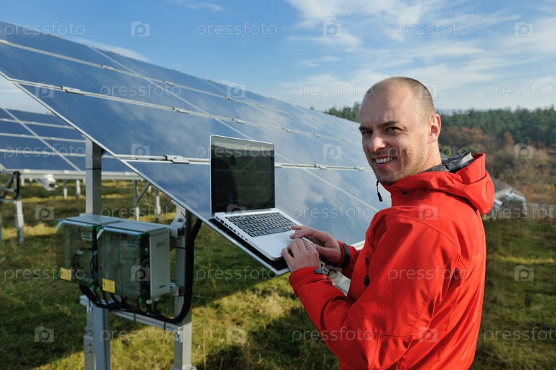 Молодой инженер с ноутбуком около солнечных панелей, производящих электричество