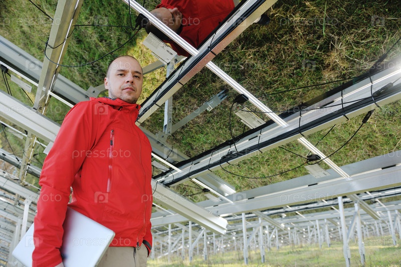 Молодой инженер с ноутбуком около солнечных панелей, производящих электричество