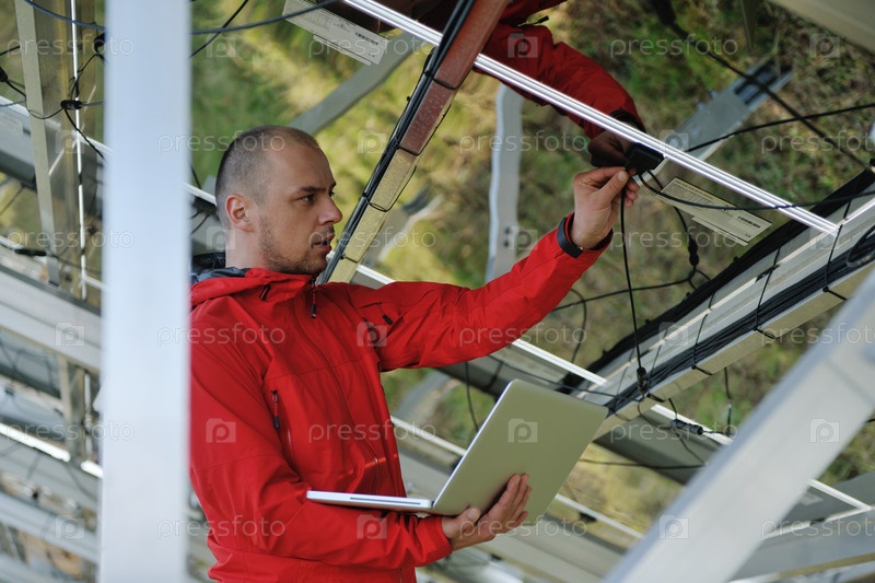Молодой инженер с ноутбуком около солнечных панелей, производящих электричество
