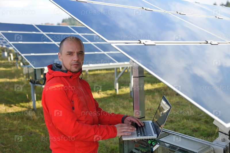 Молодой инженер с ноутбуком около солнечных панелей, производящих электричество