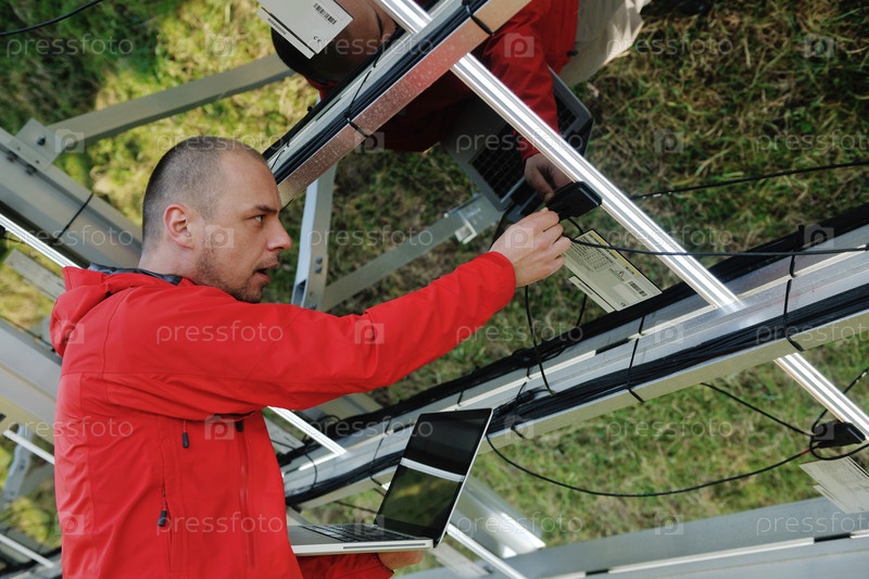 Молодой инженер с ноутбуком около солнечных панелей, производящих электричество