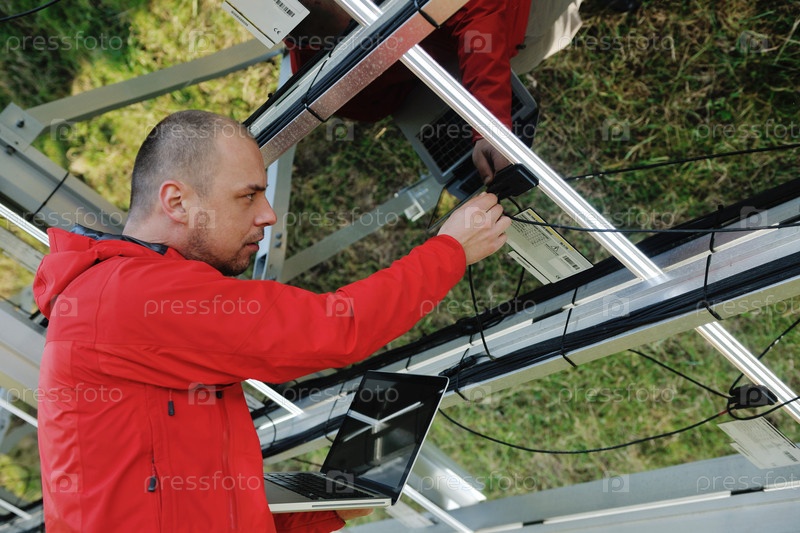 Молодой инженер с ноутбуком около солнечных панелей, производящих электричество