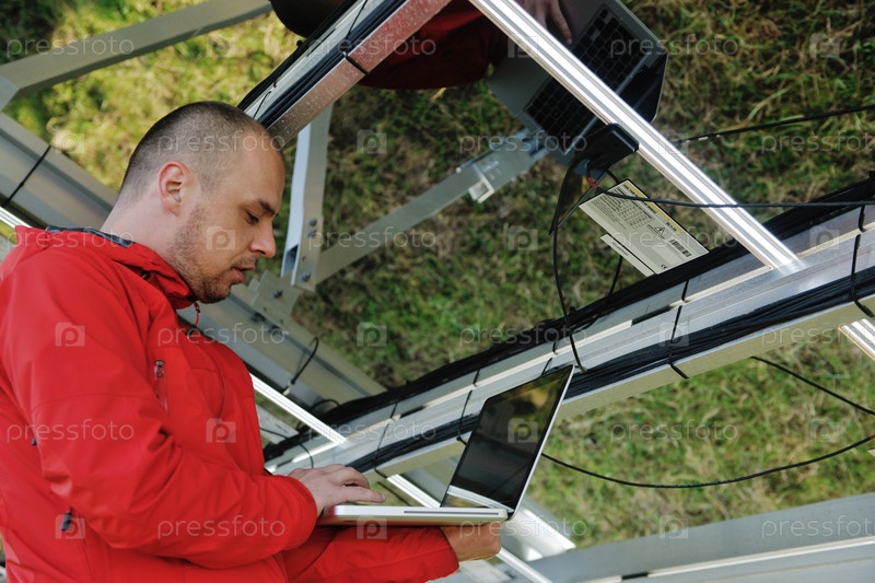 Молодой инженер с ноутбуком около солнечных панелей, производящих электричество