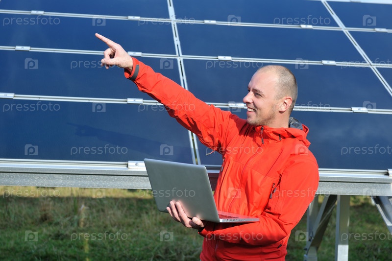 Молодой инженер с ноутбуком около солнечных панелей, производящих электричество