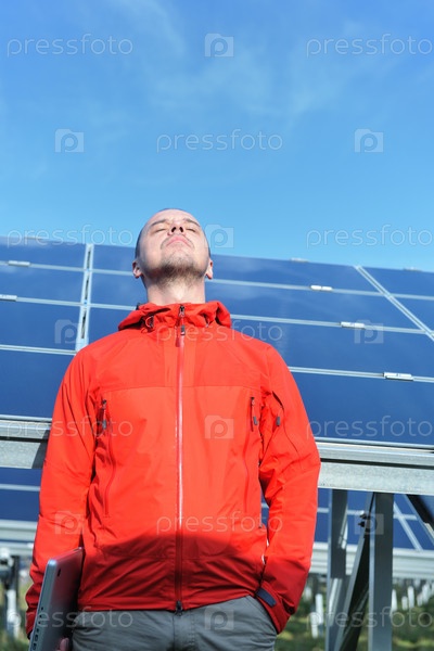 Молодой инженер с ноутбуком около солнечных панелей, производящих электричество