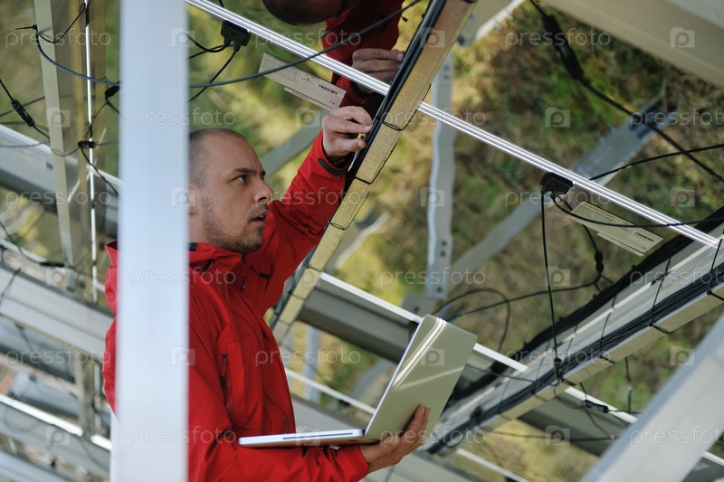 Молодой инженер с ноутбуком около солнечных панелей, производящих электричество