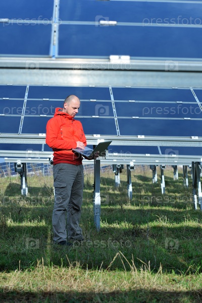 Молодой инженер с ноутбуком около солнечных панелей, производящих электричество