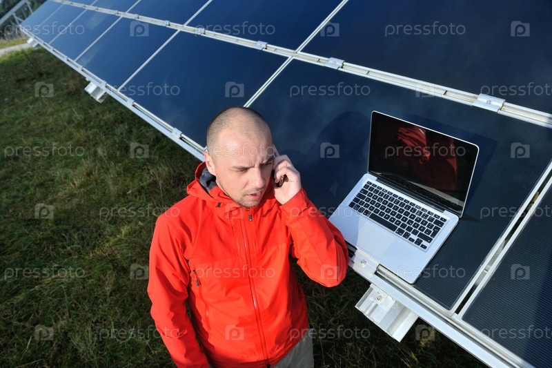 Молодой инженер говорит по телефону около солнечных панелей, производящих электричество