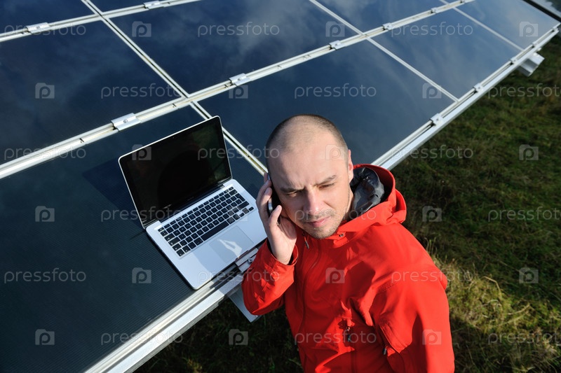 Молодой инженер говорит по телефону около солнечных панелей, производящих электричество