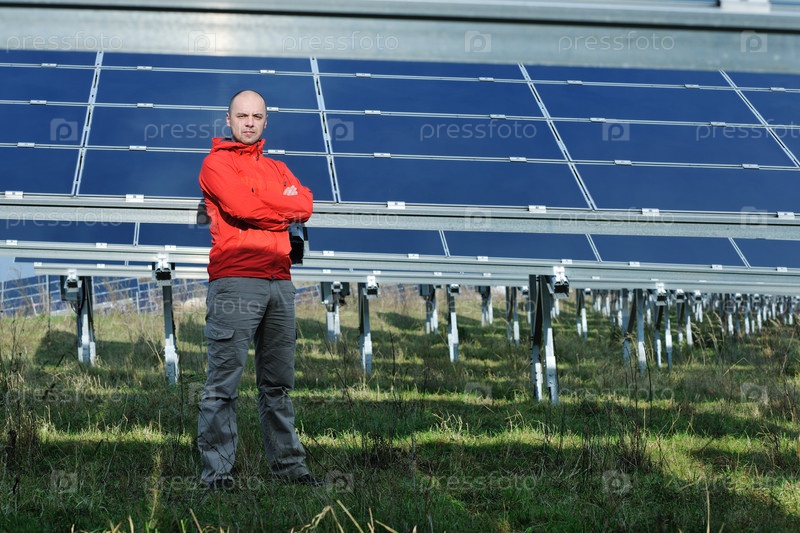 Молодой инженер на фоне солнечных панелей, производящих электричество