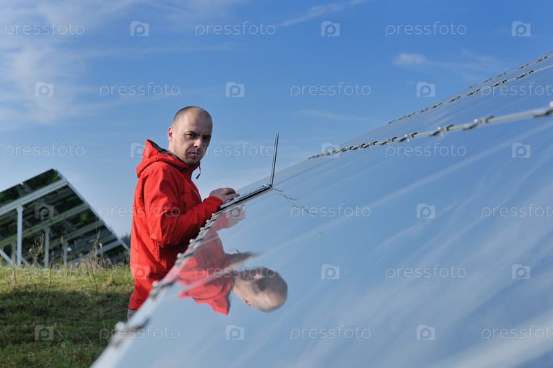 Молодой инженер с ноутбуком около солнечных панелей, производящих электричество