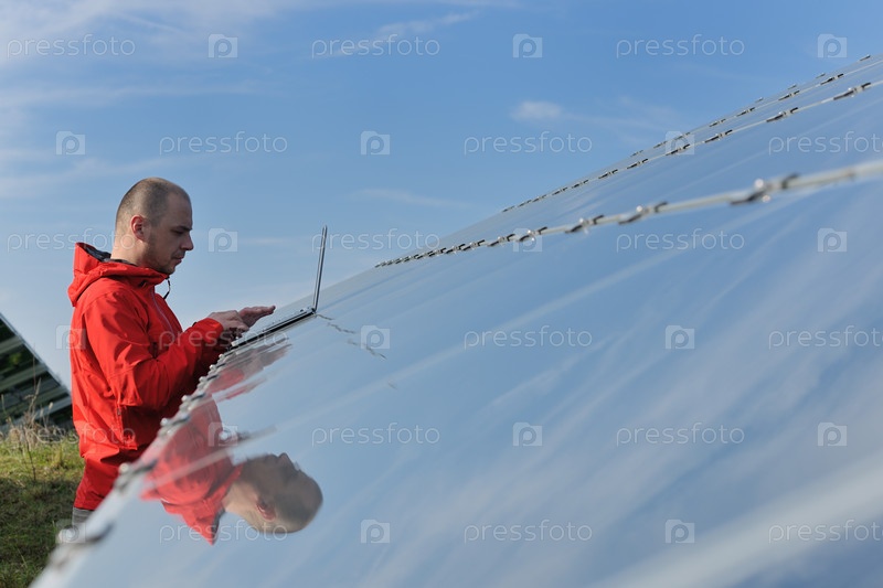 Молодой инженер с ноутбуком около солнечных панелей, производящих электричество