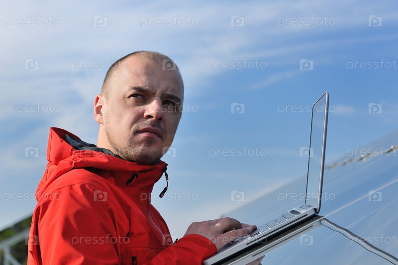 Молодой инженер с ноутбуком около солнечных панелей, производящих электричество