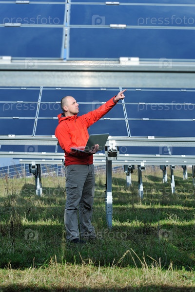 Молодой инженер с ноутбуком около солнечных панелей, производящих электричество