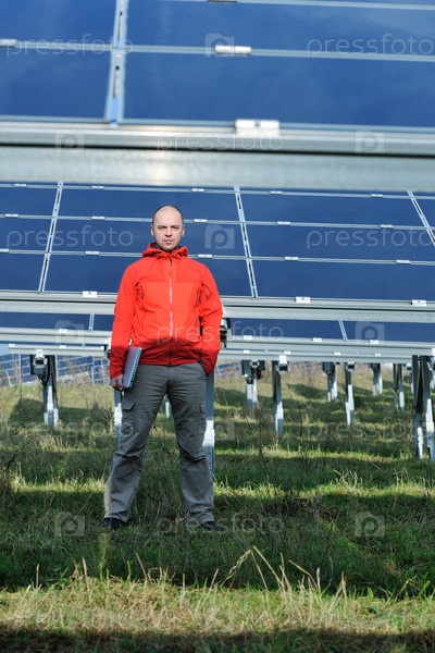 Молодой инженер с ноутбуком около солнечных панелей, производящих электричество