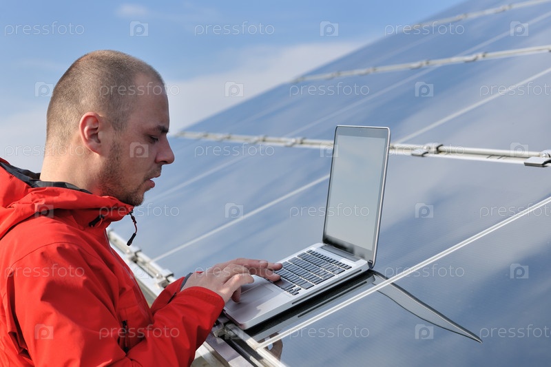 Молодой инженер с ноутбуком около солнечных панелей, производящих электричество