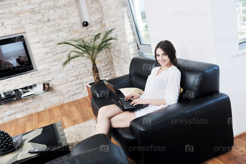 Девушка сидит на диване с ноутбуком