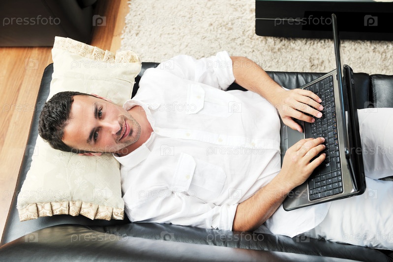 Молодой мужчина лежит на диване с ноутбуком