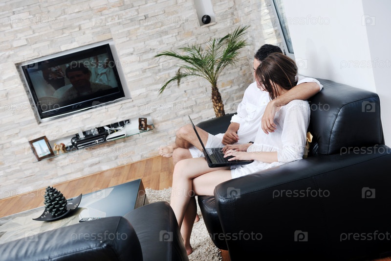 Молодая пара сидит на диване с ноутбуком