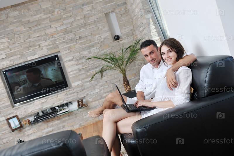Молодая пара сидит с ноутбуком в домашней обстановке