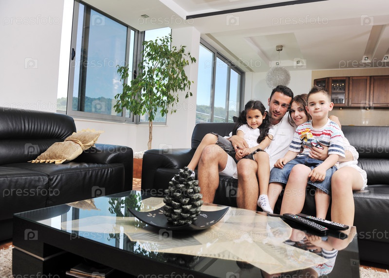 Счастливая молодая семья смотрит телевизор в гостиной