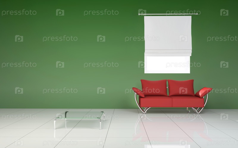 Интерьер комнаты с красным диваном и зеленой стеной