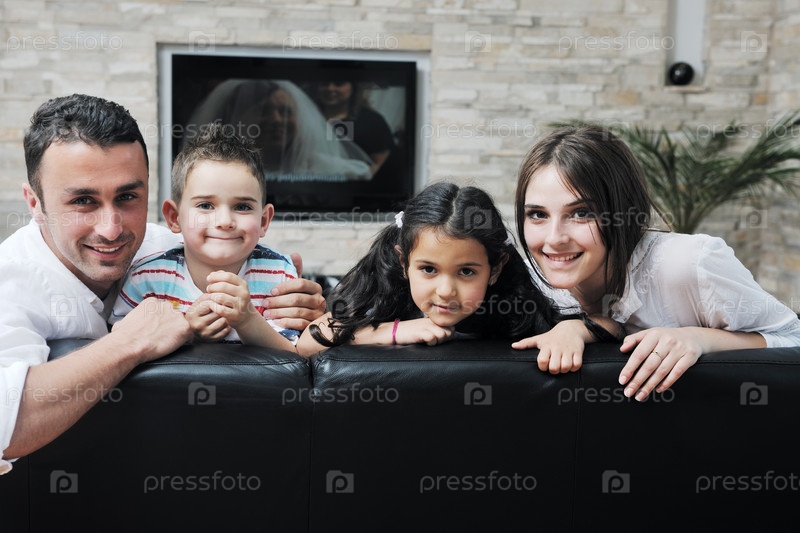 Счастливая молодая семья на диване в гостиной