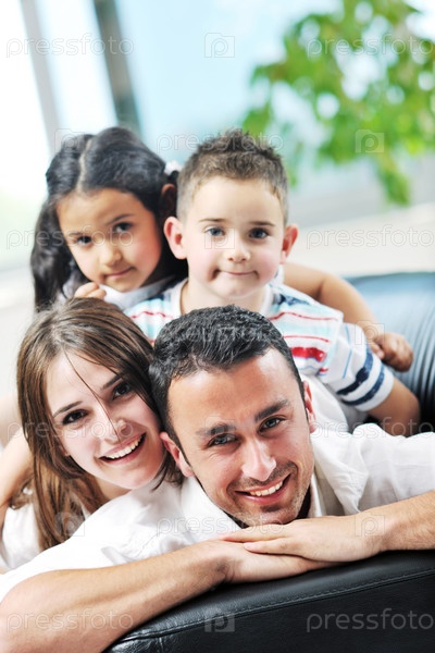 Счастливая молодая семья на диване в гостиной